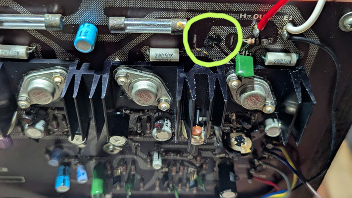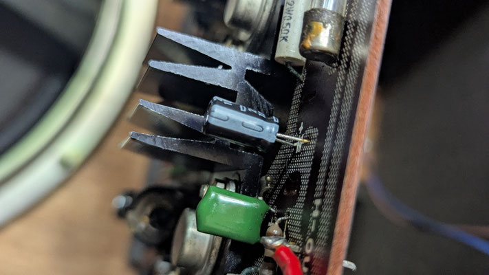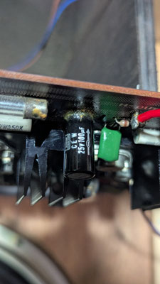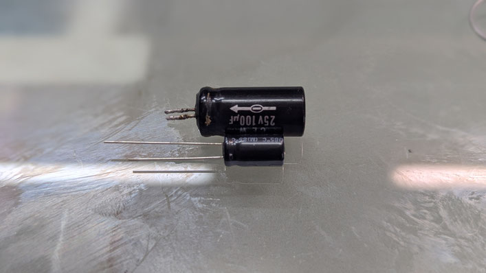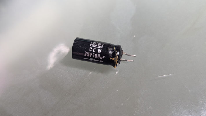 コンデンサは痛むと上部が膨らむらしいのですが、これは下部かな???